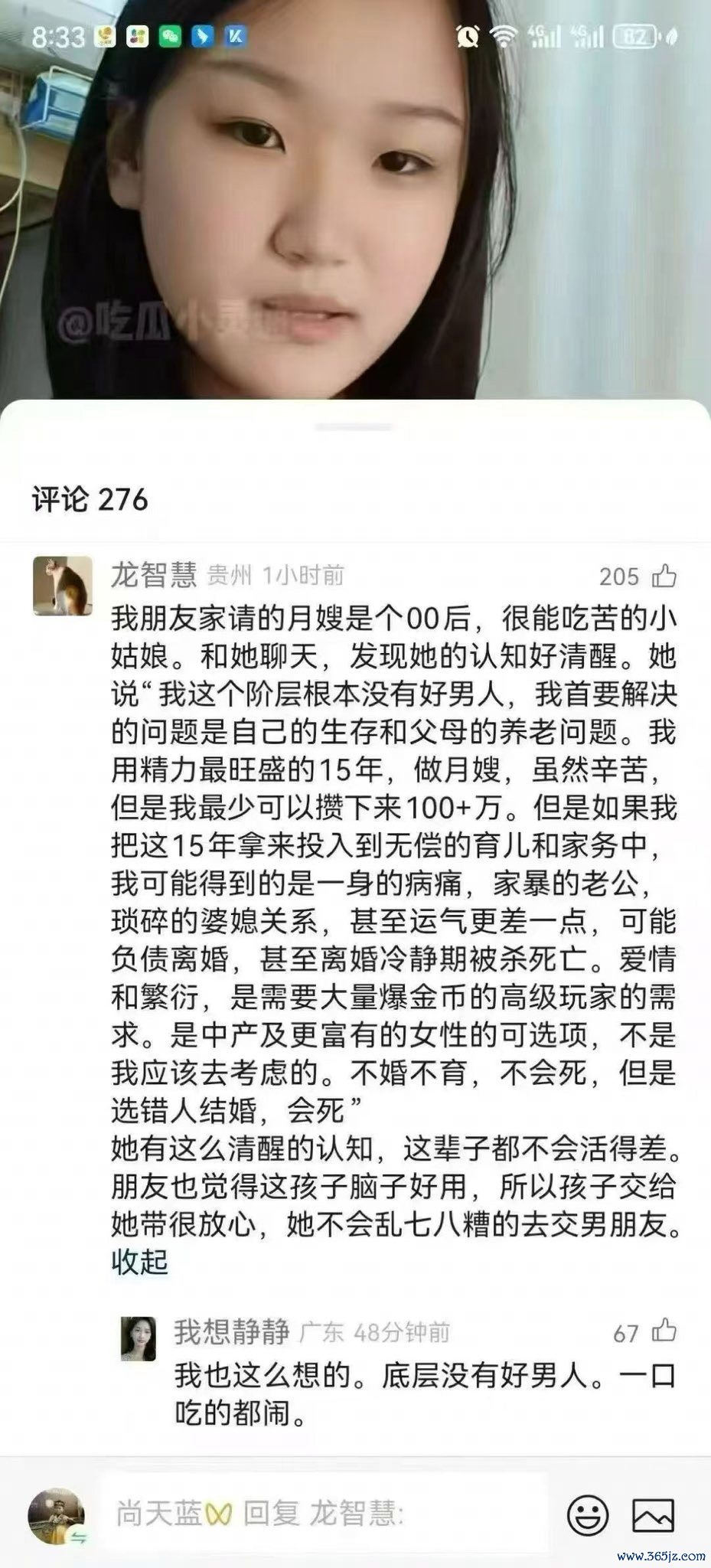根据这名月嫂雇主的介绍,该00后月嫂告诉她:我这个阶层根本没有好男人,我首要解决的问题是自己的生存和父母的养老问题。要用自己精力最旺盛的15年,攒下100多万。如果在这15年间选择结婚,不但攒不下这100多万,还可能会一身的病痛,遇到家暴的老公,琐碎的婆媳关系,甚至运气更差一点,可能负债离婚,甚至离婚冷静期被杀死亡。不婚不育,不会死,但是选错人结婚,会死。