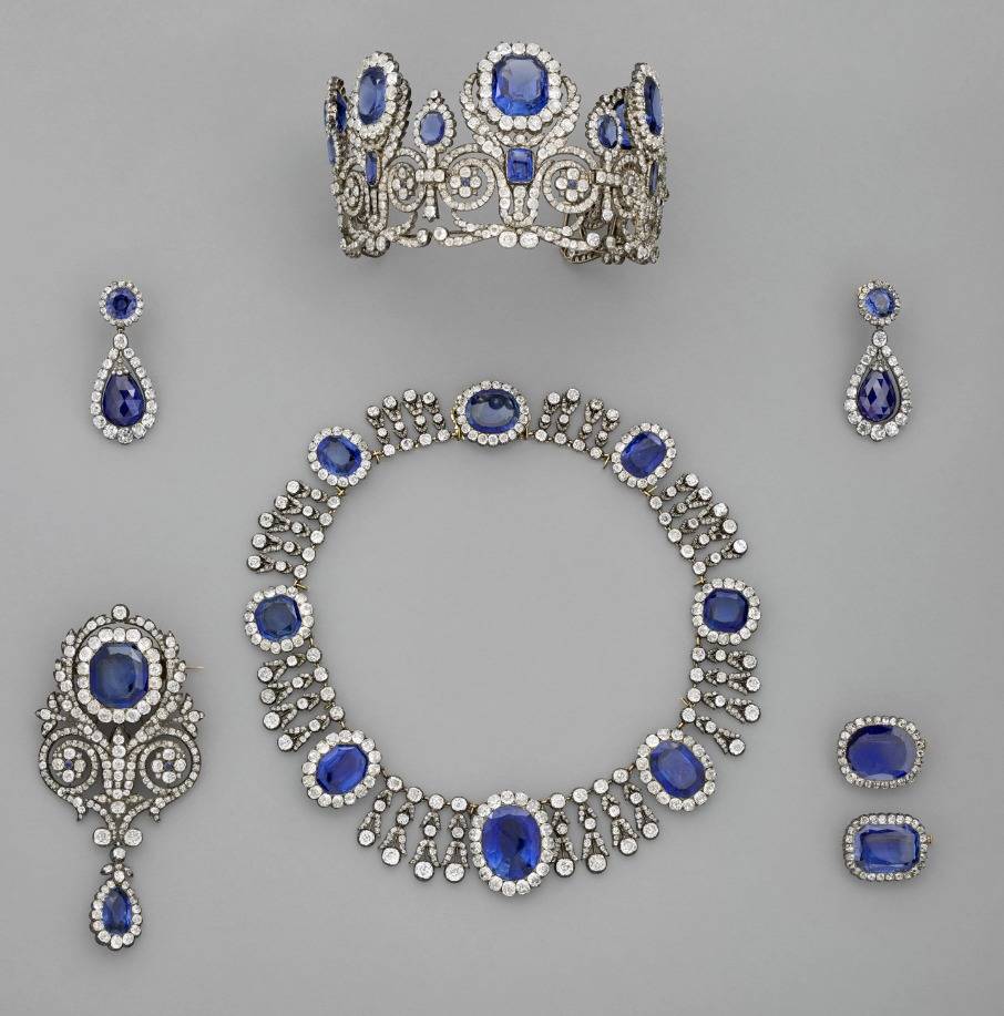 △玛丽-阿梅莉王后与奥坦丝王后的头饰、蓝宝石项链及蓝宝石耳环(资料图)